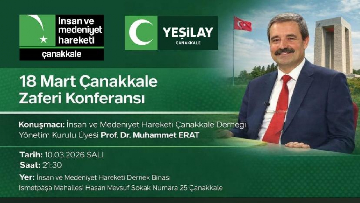 Sosyal Bilgiler Eğitimi Anabilim Dalı Başkanı Prof.Dr. Muhammet Erat, 10 Mart 2026 Salı günü saat 21.30'da İnsan ve Medeniyet Hareketi Çanakkale Şubesi'nde Çanakkale Yeşilay Şubesi ile işbirliği çerçevesinde düzenlenen etkinlikte 18 Mart Çanakkale Zaferi konferansı verecektir. İlgilenen tüm akademik ve idari personel ile öğrencilerimiz davetlidir.