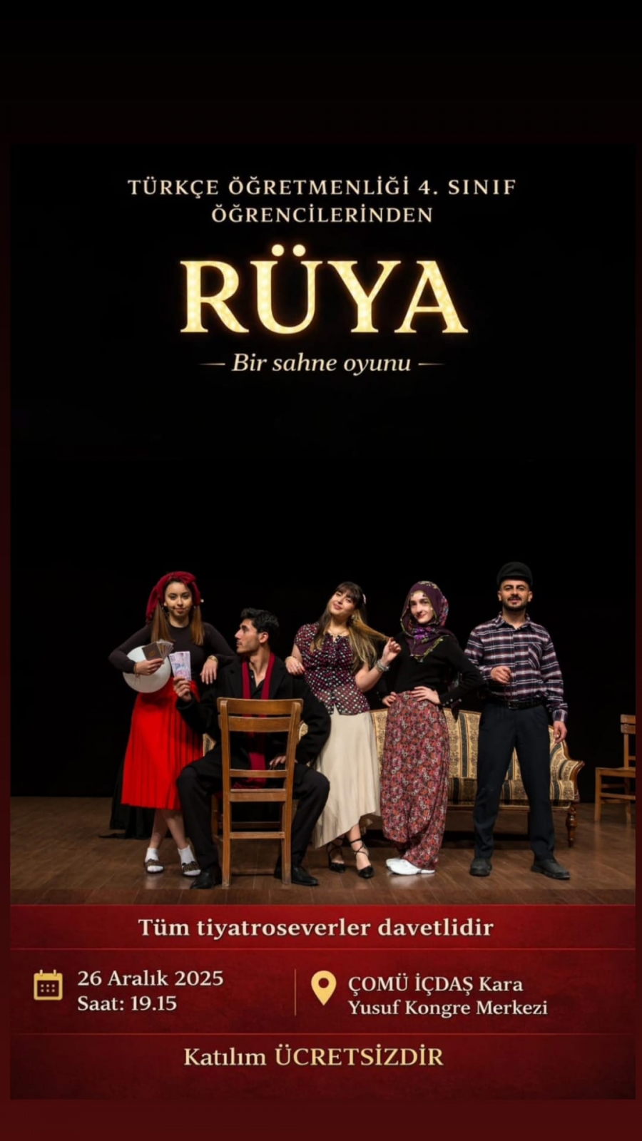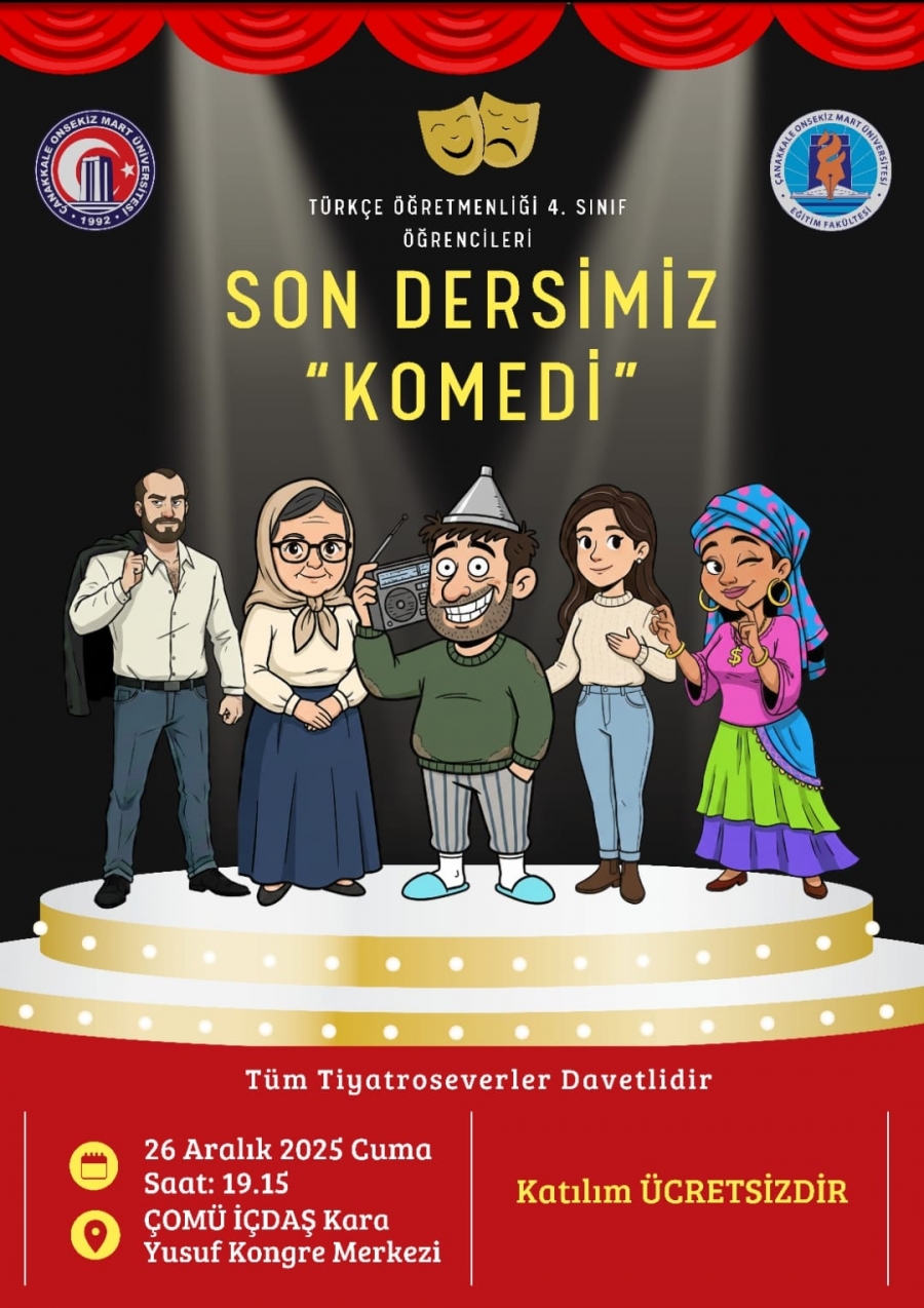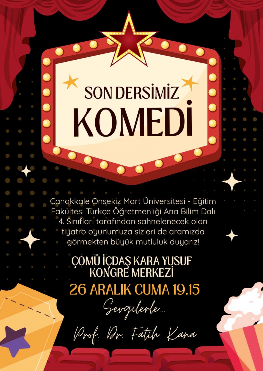 Fakültemiz Türkçe Öğretmenliği Ana Bilim Dalı 4. sınıf öğrencileri tarafından hazırlanan "Son Dersimiz Komedi" adlı tiyatro oyunu izleyicisiyle buluşuyor.