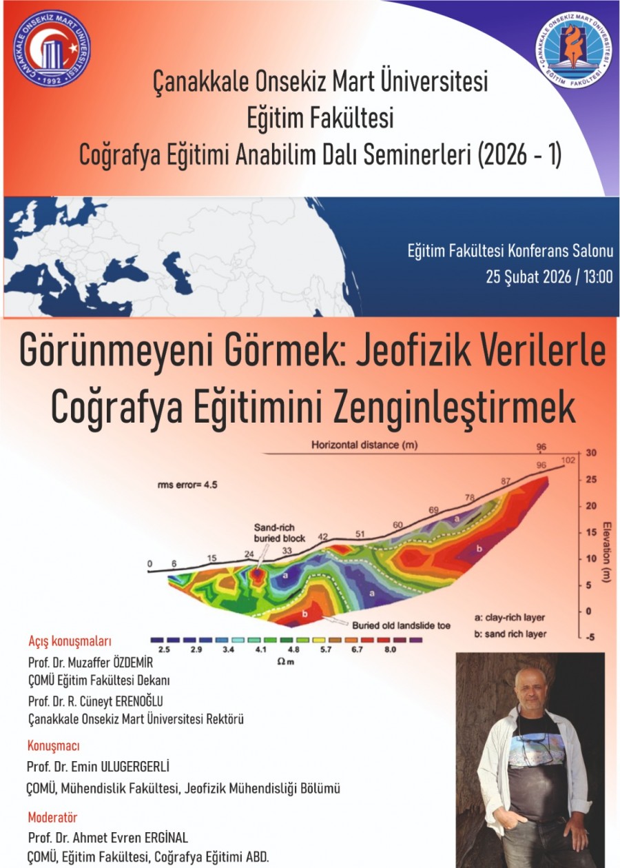 Çanakkale Onsekiz Mart Üniversitesi Eğitim Fakültesi Coğrafya Eğitimi Anabilim Dalı tarafından düzenlenen 2026 yılı bahar dönemi seminerleri kapsamında, “Görünmeyeni Görmek: Jeofizik Verilerle Coğrafya Eğitimini Zenginleştirmek” başlıklı seminer gerçekleştirilecektir.