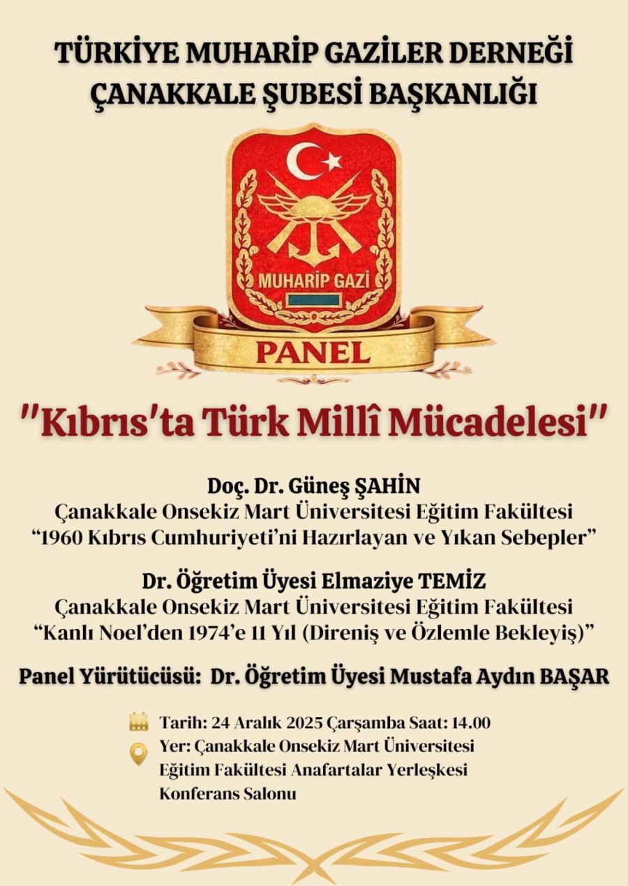 21-25 Aralık milli mücadele ve şehitler haftası kapsamında Türkiye muharip gaziler derneği Çanakkale şubesi başkanlığının organizasyonu ile gerçekleştirilecek panele bölümümüz tarih eğitimi öğretim üyelerinden Doç. Dr. Güneş Şahin ‘1960 Kıbrıs cumhuriyetini hazırlayan ve yıkan sebepler’ başlıklı bir konuşma yapacaktır….