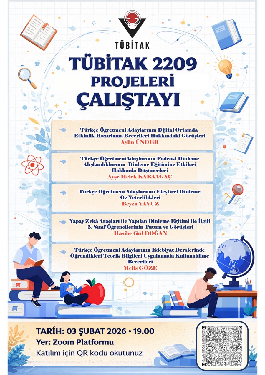 Bölümümüz Türkçe Eğitimi Anabilim Dalı öğretim üyeleri Prof. Dr. Fatih KANA ve Doç. Dr. Hulusi Geçgel danışmanlığında yürütülen TÜBİTAK 2209-A Üniversite Öğrencileri Araştırma Projeleri kapsamında hazırlanan çalışmaların paylaşılacağı “TÜBİTAK 2209 Projeleri Çalıştayı”, 03 Şubat 2026 tarihinde saat 19.00’da çevrim içi ortamda (Microsoft Teams) gerçekleştirilecektir.