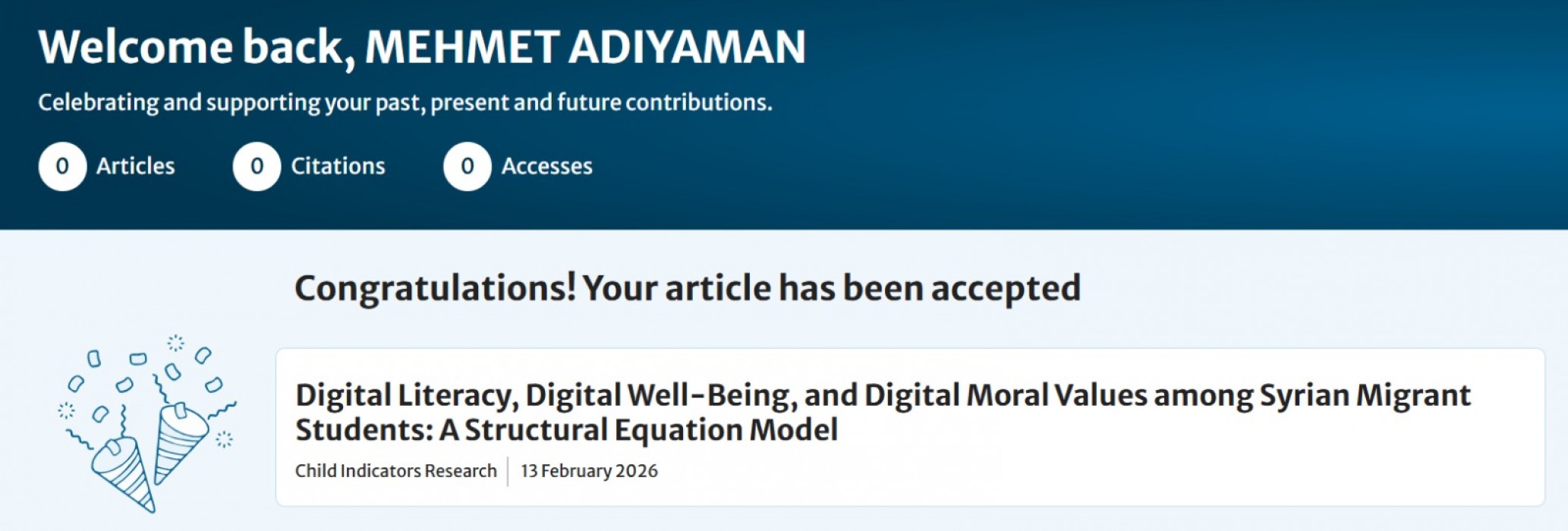 Çanakkale Onsekiz Mart Üniversitesi Lisansüstü Eğitim Enstitüsü Yabancı Dil Olarak Türkçenin Öğretimi yüksek lisans öğrencisi Mehmet Adıyaman’ın, Doç. Dr. Hulusi Geçgel ile birlikte hazırladığı yüksek lisans tez çalışması kapsamında üretilen “Digital Literacy, Digital Well-Being, and Digital Moral Values among Syrian Migrant Students: A Structural Equation Model” başlıklı araştırma, uluslararası saygınlığı yüksek ve SSCI indeksinde Q1 kategorisinde yer alan Child Indicators Research dergisinde yayımlanmak üzere kabul edilmiştir.